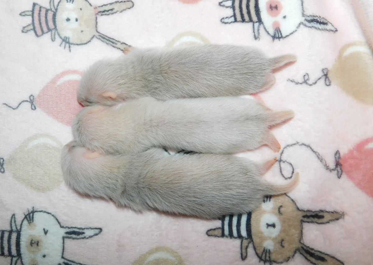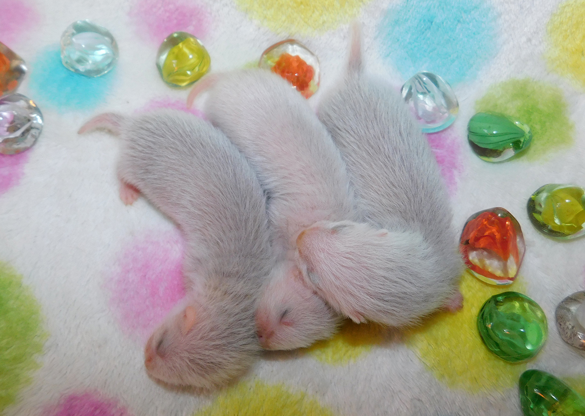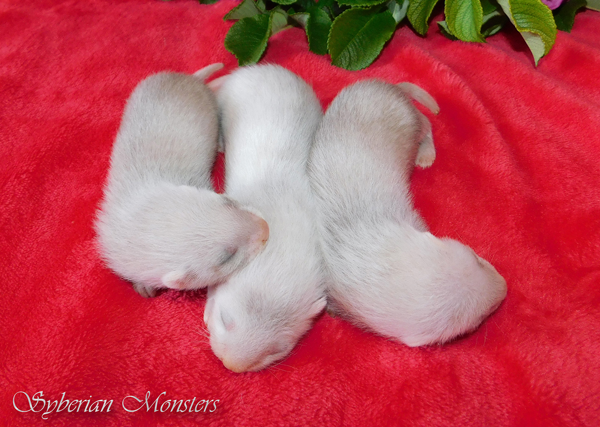 chocolate point 1/2 angora cinnamon mitt Ur. 22.04.2018r Idealnie w 42 ciąży przyszły na świat maluszki Chilli i Raphaela, a tym samym moje pierwsze tegoroczne maluszki. Maluszków urodziło się 5 w tym jeden martwy samczyk, który prawdopodobnie poddusił się w czasie porodu. Waga urodzeniowa maluszków to 10, 11, 12, 13 gram. Niestety po pierwszej dobie opuściła nas najmniejsza z samiczek, podejrzewam, że mogła zostać przygnieciona przez mamę.